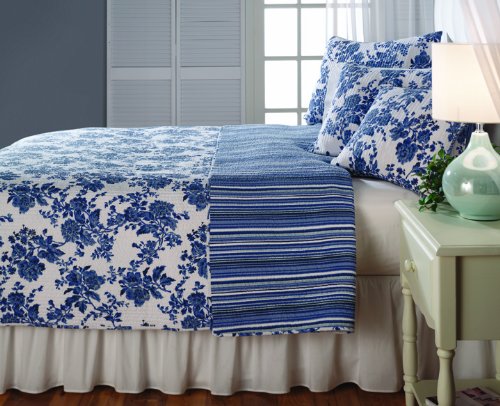 This quilt has a porcelain inspired look. Set includes quilt and two king shams. Bedding is available in a beautiful blue and white floral print. Exquisite pattern takes a casual turn with a coordinating stripe on the back in indigo. Fabric will continue to soften with each laundering. 100-Percent cotton