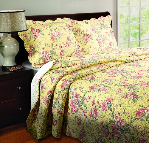 Bring a vintage botanical landscape into your bedroom with a flourish of striking red blooms, hummingbirds and butterflies. Vermicelli stitched all over for durability and surface interest, this quilt set comes with two pillow shams (one sham per twin set) and is oversized for better coverage on today's deeper mattresses. Sizes: 68 by 88-Inch Twin, 90 by 90-Inch Full/Queen, 105 by 95-Inch King, Standard Shams 20 by 26-Inch, King Sham 20-Inch by 36-Inch.