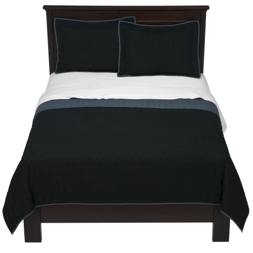 Create a touch of drama in your bedroom with this king-size black quilt by Room Essentials®. The polyester quilt features a narrow gray border and comes with two matching pillow shams for a coordinated look. This set will add impact to any contemporary dĂ©cor.
